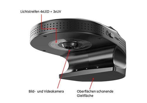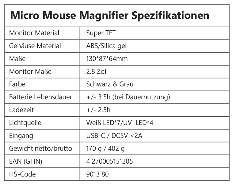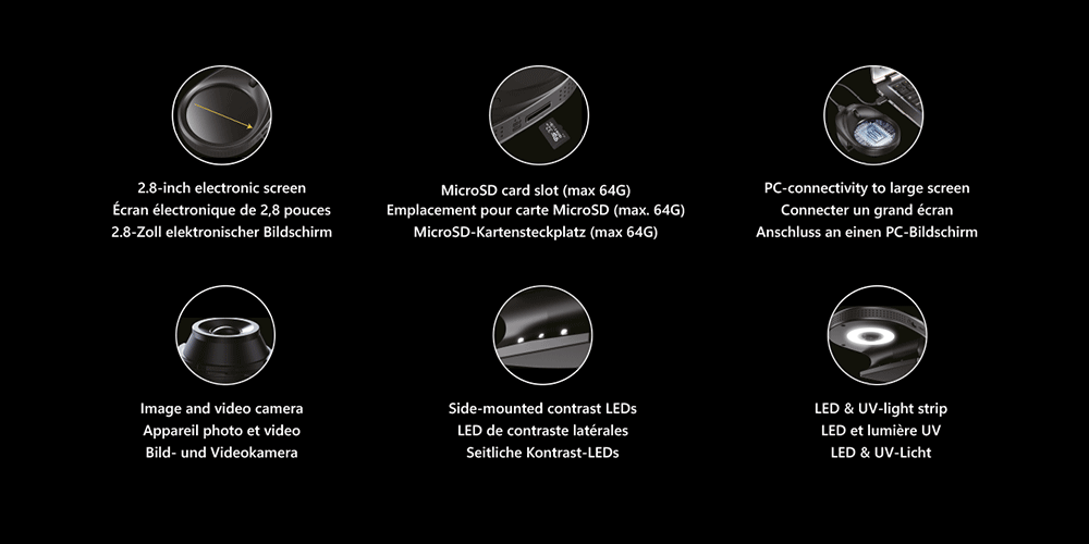 - 4x weiße LEDs + 4x UV LEDs (365nm) für perfektes Ausleuchten von Details